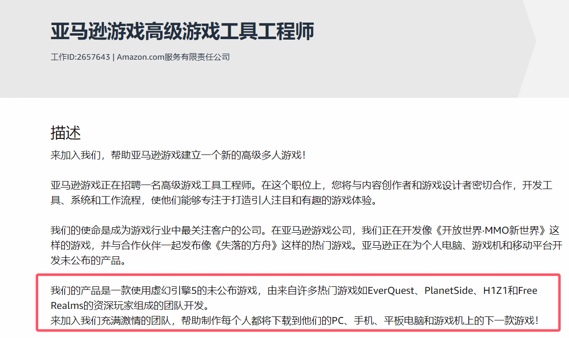 在最近,Reddit论坛上的用户@RinRinDoof发现,亚马逊游戏正在招募一名高级游戏工具工程师,从相关的职位介绍中,我们可以了解到该项目的部分现状:游戏将会使用虚幻五引擎进行开发,并且计划在多平台上发布,包括PC、主机以及手机。